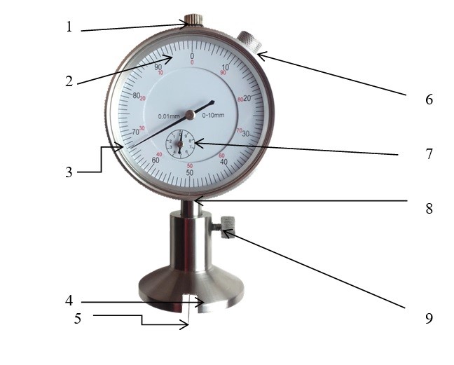 1 – головка; 2 – основной циферблат; 3 – стрелка-индикатор; 4 – опорная насадка; 5 – индентор; 6 – винт для фиксации ободка; 7 – малый циферблат; 8 – неподвижный кожух штока; 9 – винт для фиксации насадки.